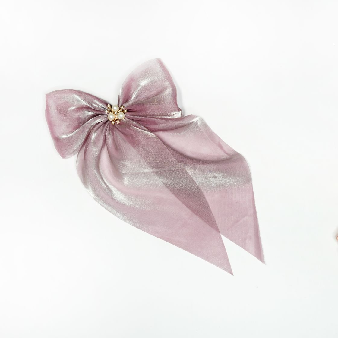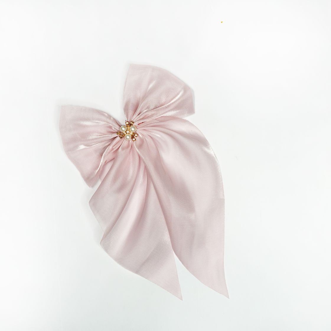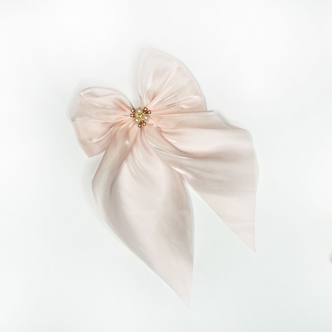 Add a touch of timeless charm to your hairstyle with this beautifully crafted bow made from soft, shimmering organza. Designed with a flowing, petal-like silhouette and finished with a delicate central cluster of pearls and crystals, it’s the perfect accessory for special occasions or elevating everyday looks.