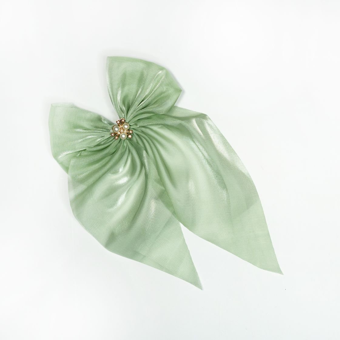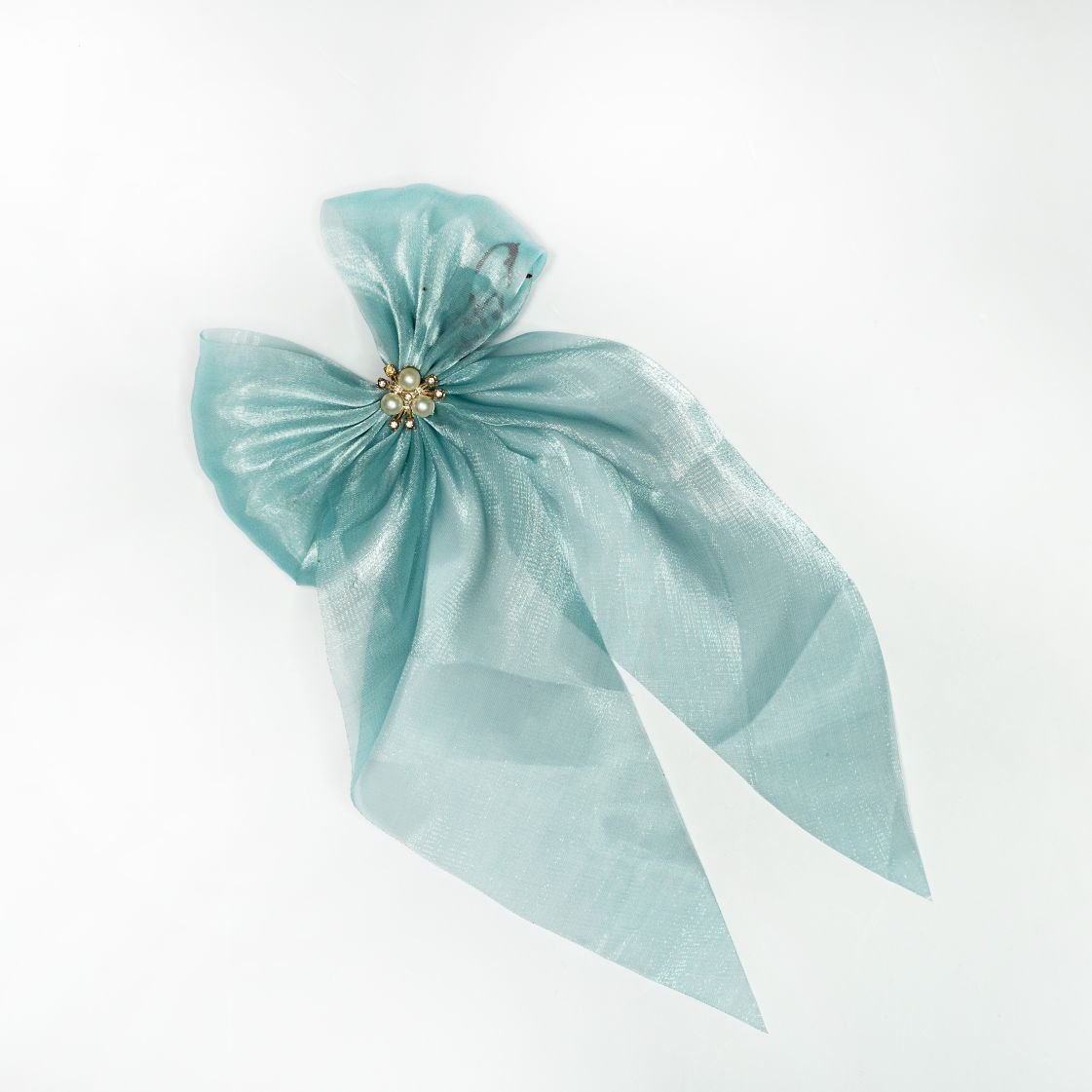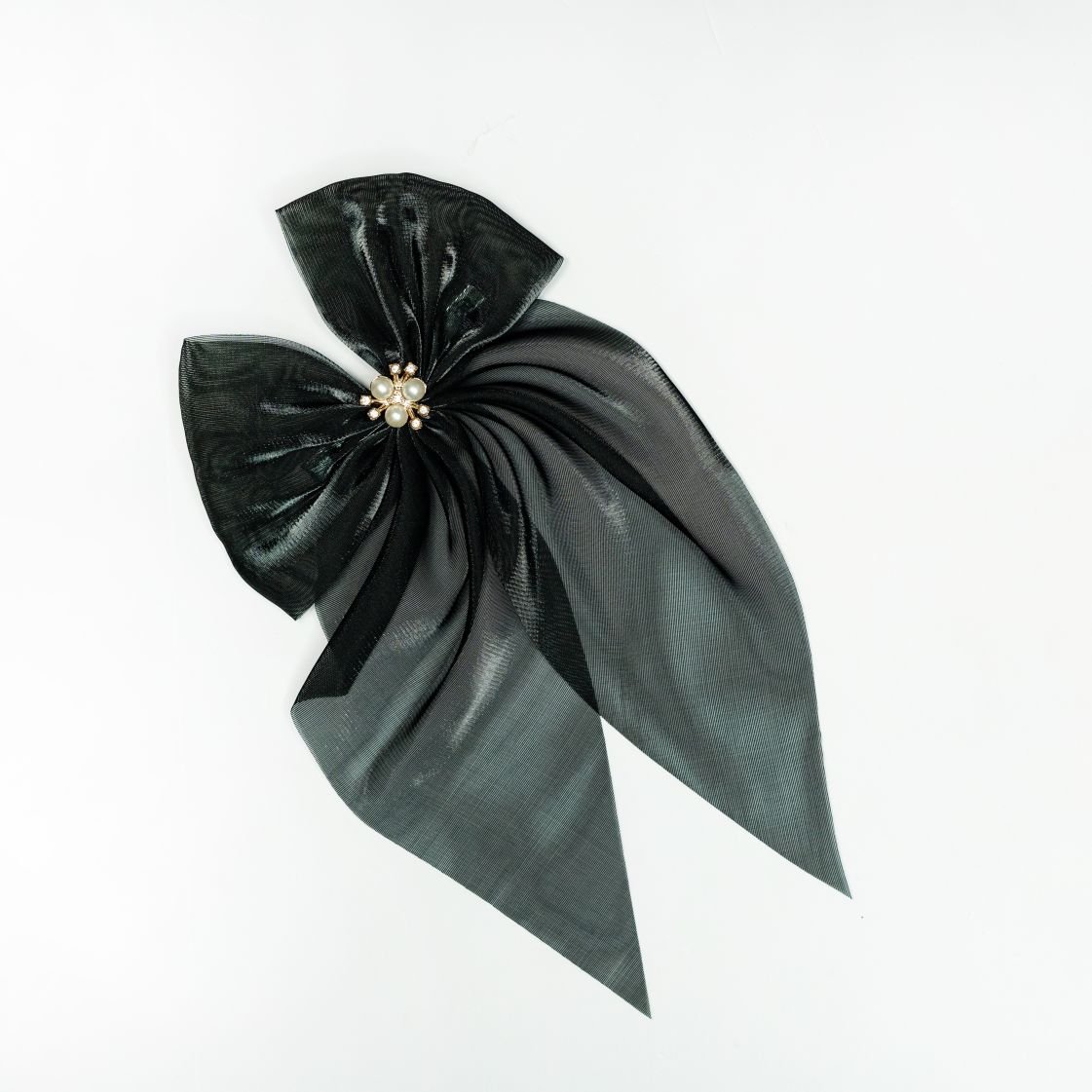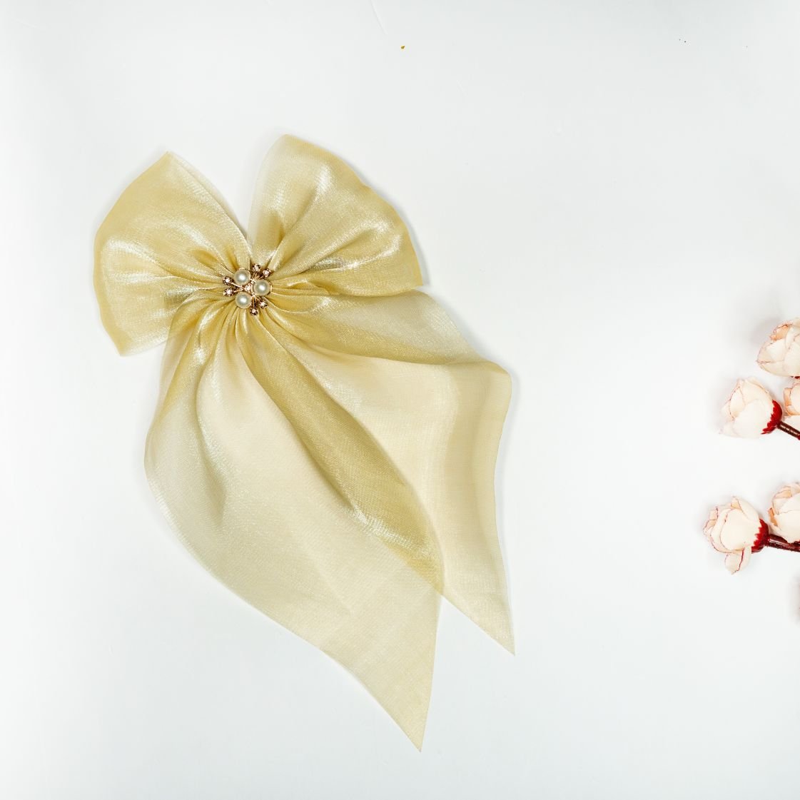 Add a touch of timeless charm to your hairstyle with this beautifully crafted bow made from soft, shimmering organza. Designed with a flowing, petal-like silhouette and finished with a delicate central cluster of pearls and crystals, it’s the perfect accessory for special occasions or elevating everyday looks.