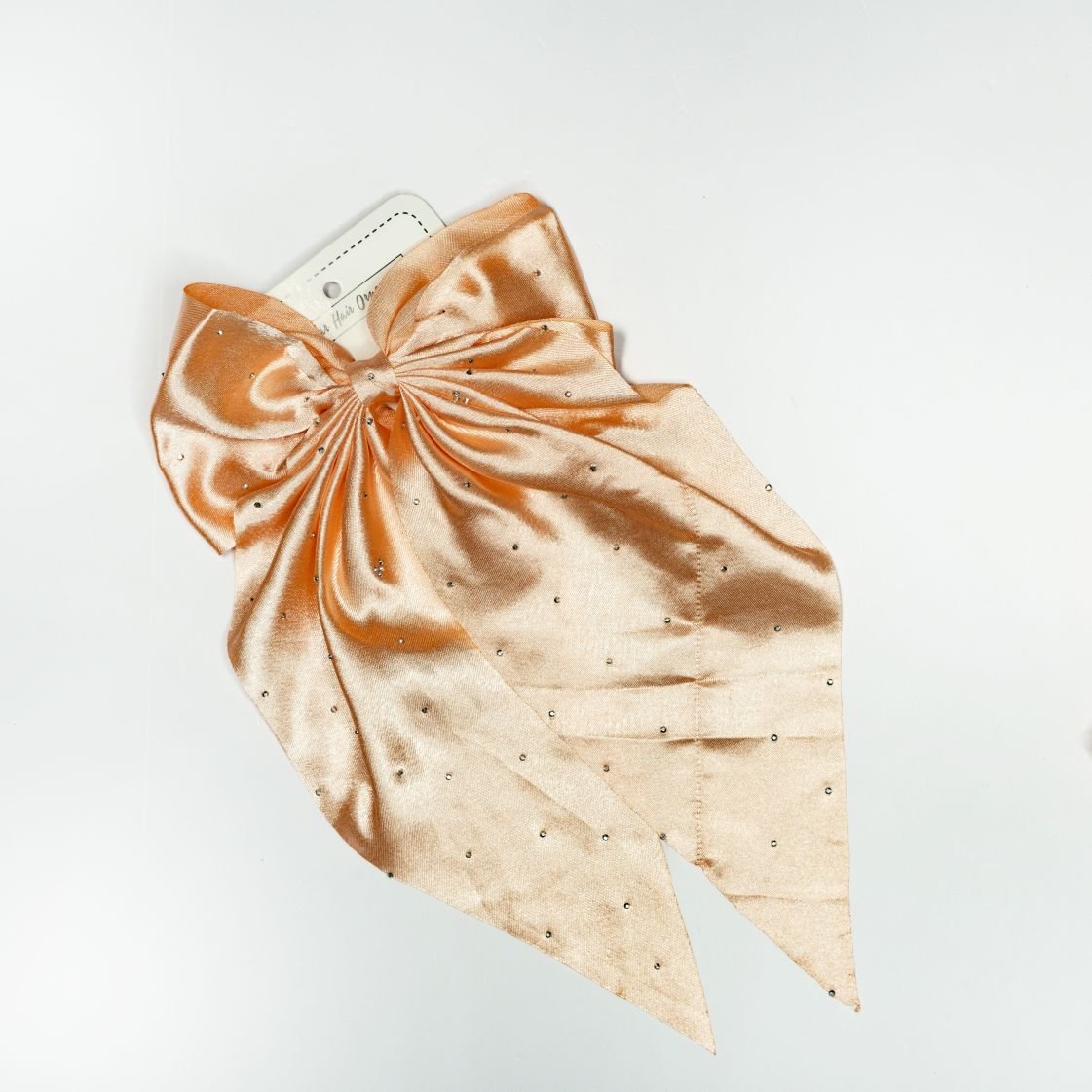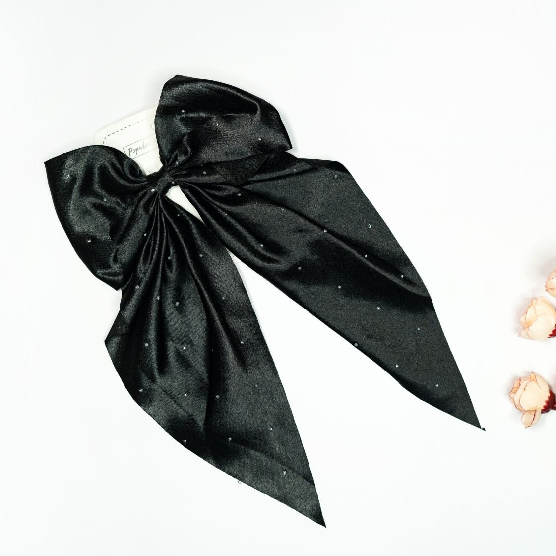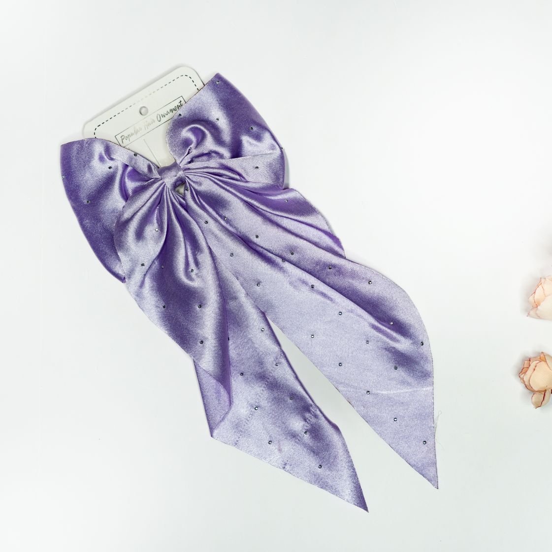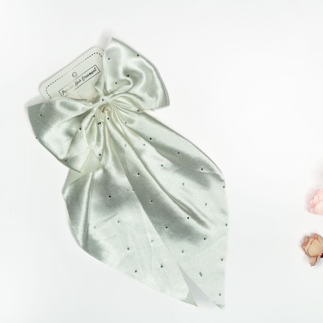 Elevate your hairstyle with this elegant satin bow adorned with delicate rhinestones. Featuring long, flowing tails and a radiant finish, it’s the perfect accessory to add a touch of sparkle to any look — from casual chic to formal flair.