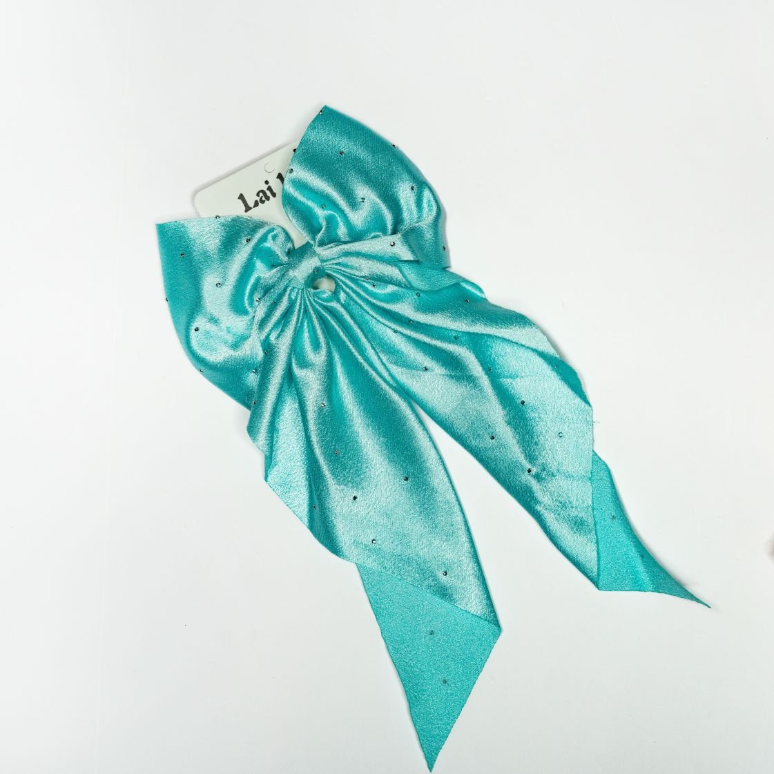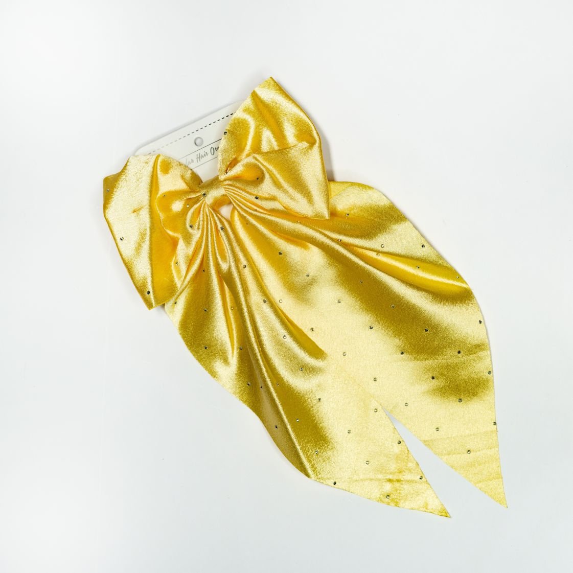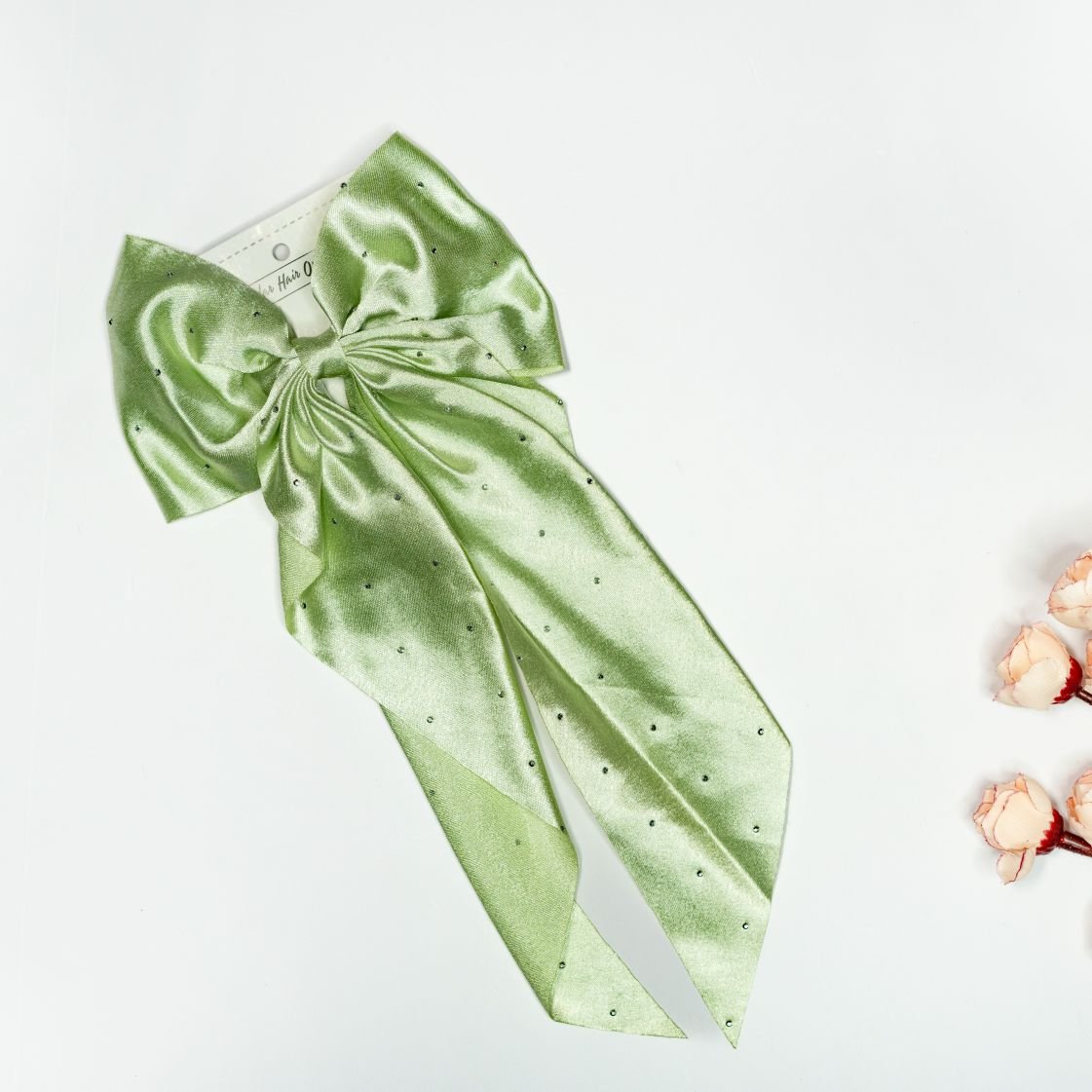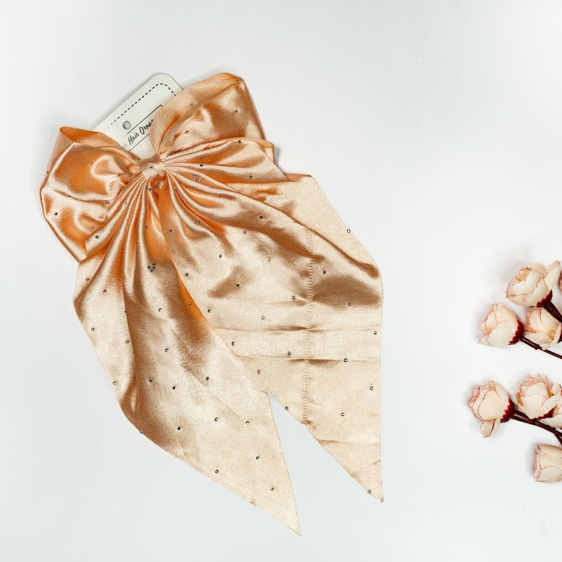 Elevate your hairstyle with this elegant satin bow adorned with delicate rhinestones. Featuring long, flowing tails and a radiant finish, it’s the perfect accessory to add a touch of sparkle to any look — from casual chic to formal flair.