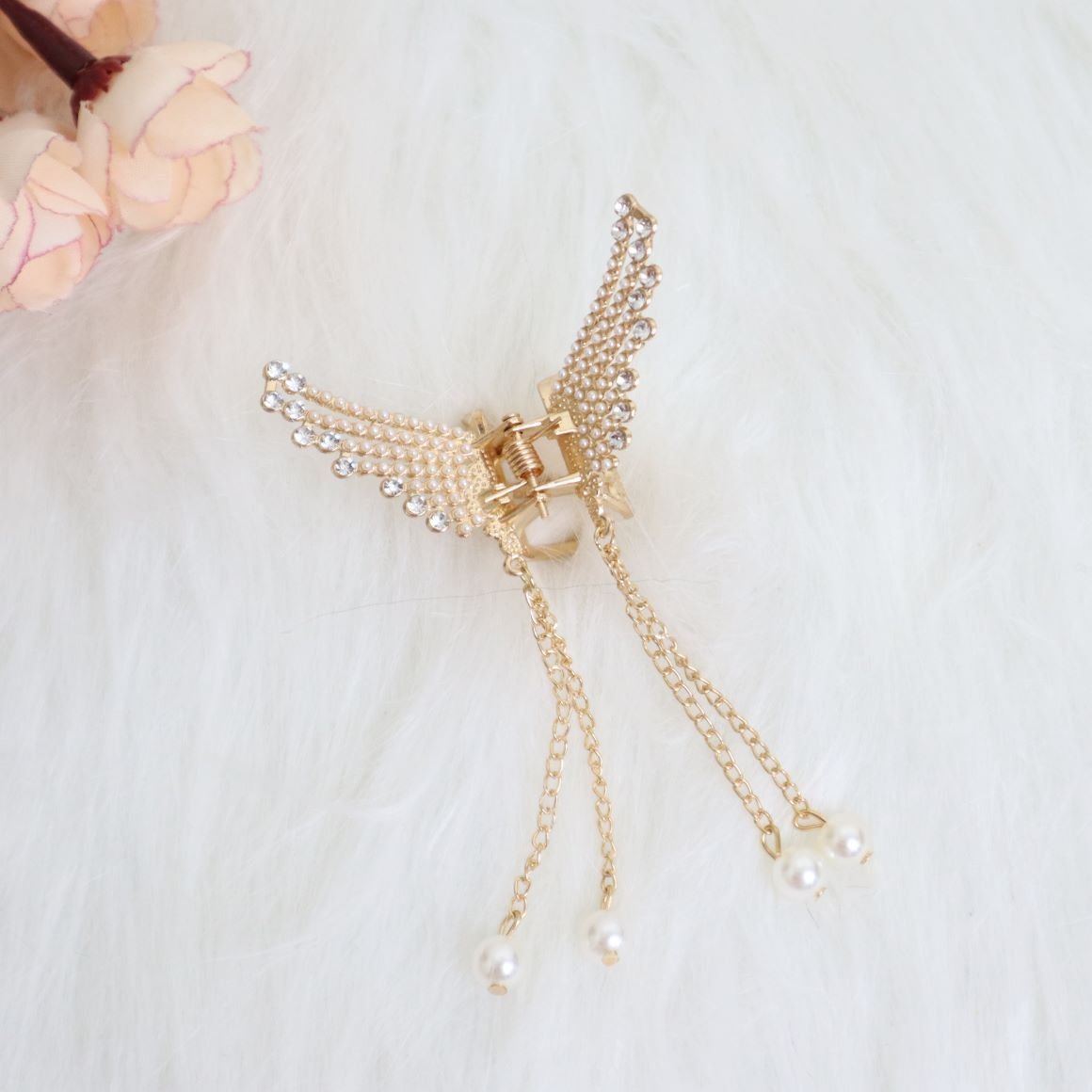 Crystal Angel Wing Hair Claw – Elegant Gold Hair Clip with Pearl Drops | Premium Clutcher for Women